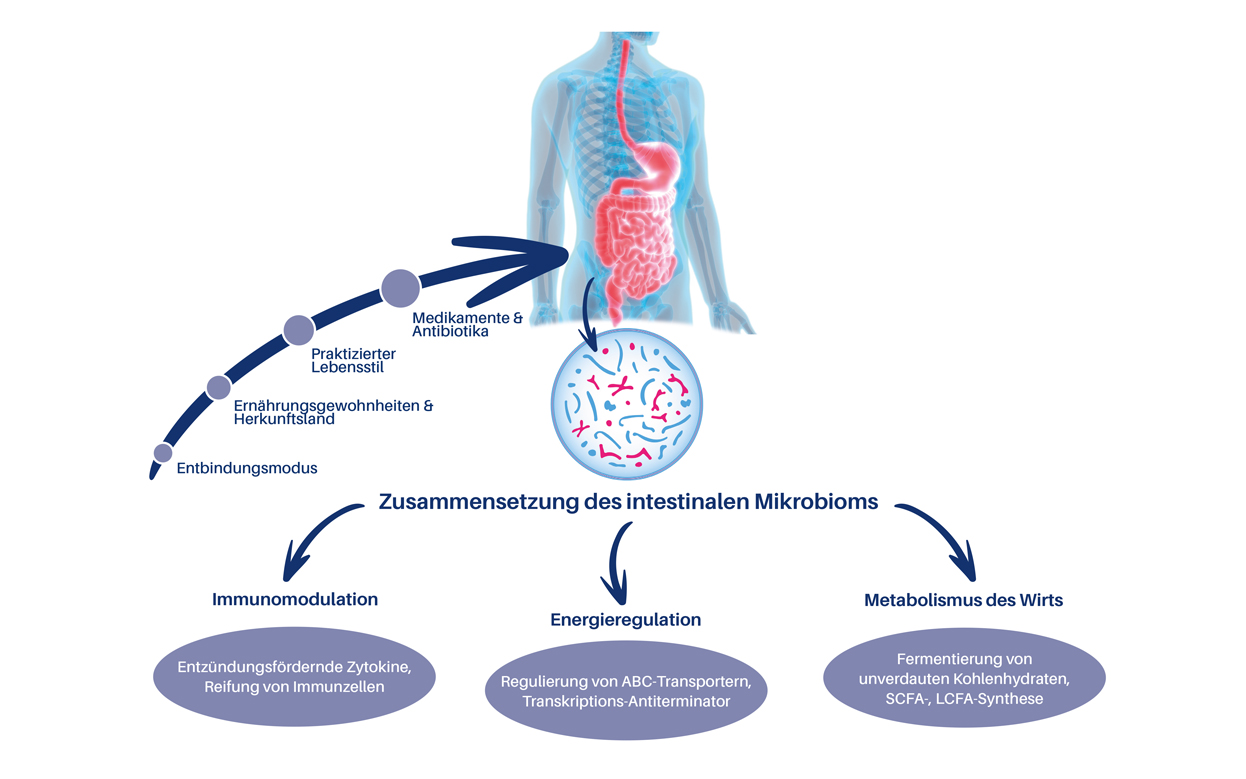Das intestinale Mikrobiom ist essenziell für die Verdauung, die Aufnahme von Nahrungsbestandteilen, die Produktion von kurzkettigen Fettsäuren und die Stärkung der Immunabwehr. Es hat somit einen wichtigen Einfluss auf die Gesundheit.
