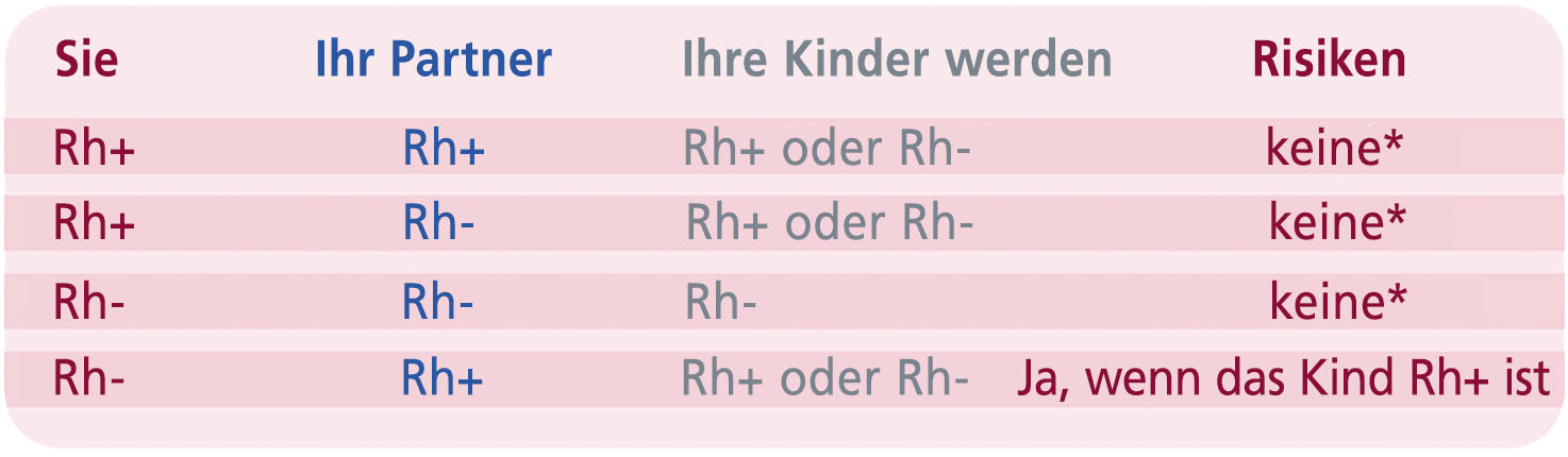 *Anmerkungen: Es gibt neben den mit dem Rhesusfaktor zusammenhängenden (anti-D) noch weitere Immunisierungen (anti-E, anti-c, anti-C, anti-e, anti-Kell ...). Diese sind seltener und im Allgemeinen weniger schwerwiegend. Das Labor, in dem die Bestimmung Ihrer Blutgruppe erfolgt, wird Sie gegebenenfalls über entsprechende Befunde informieren und Ihre medizinische Fachperson wird Ihnen die Folgen sowie den Umgang damit erklären.